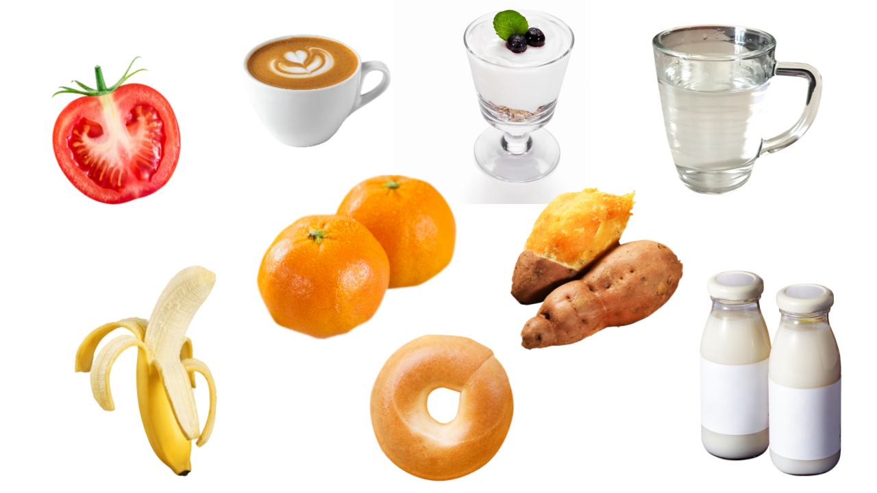✅ 커피, 토마토, 요거트, 찬물 또는 차가운 음료수, 바나나, 우유, 고구마, 귤, 빵류