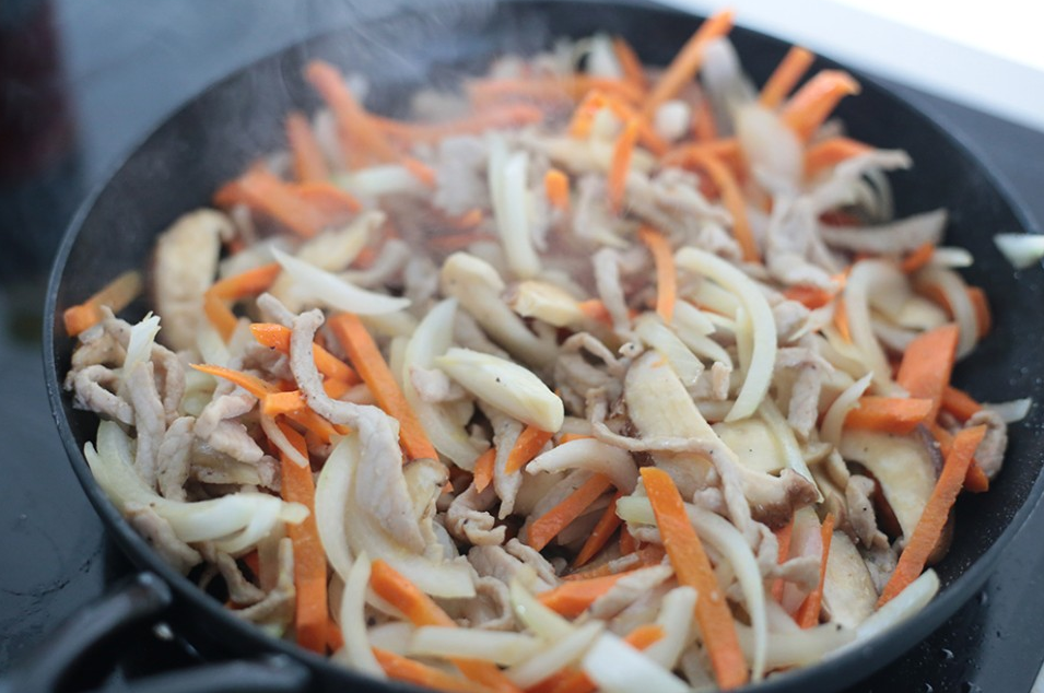 팬에 식용유를 두르고 돼지고기를 볶아주세요. 다음으로 야채를 넣어 함께 볶는데요. 야채는 오래 볶지 않기 때문에 돼지고기를 볶을 때 완전히 익혀주셔야 합니다. 돼지 고기가 완전히 익으면 부추를 제외한 나머지 재료들을 모두 넣고 소금을 살짝 뿌려 빠르게 볶아주세요.