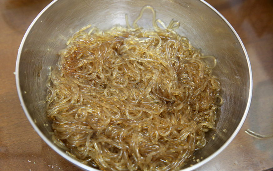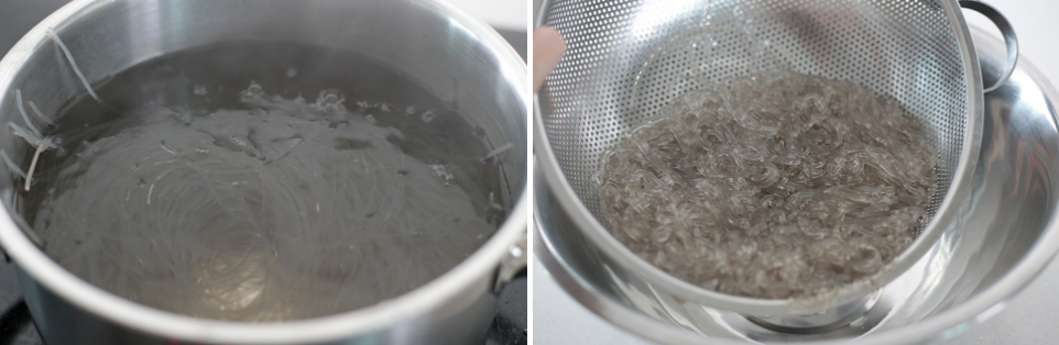 끓는 물에 불린 당면을 넣고 4분 정도 삶아줍니다. 삶은 당면은 찬물에 헹구지 않고 바로 채에 올려 탁탁 물기를 털어 준비합니다.