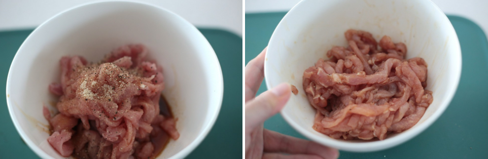 양파, 당근 채 썰고, 표고버섯 슬라이스로 썰고 부추도 적당한 길이로 썰어 놓습니다. 잡채용 돼지고기에 간장, 설탕, 맛술 1숟갈씩 넣고 후추 톡톡 뿌려 조물조물 밑간을 합니다. 그리고 10분 정도 두었다가 볶습니다.